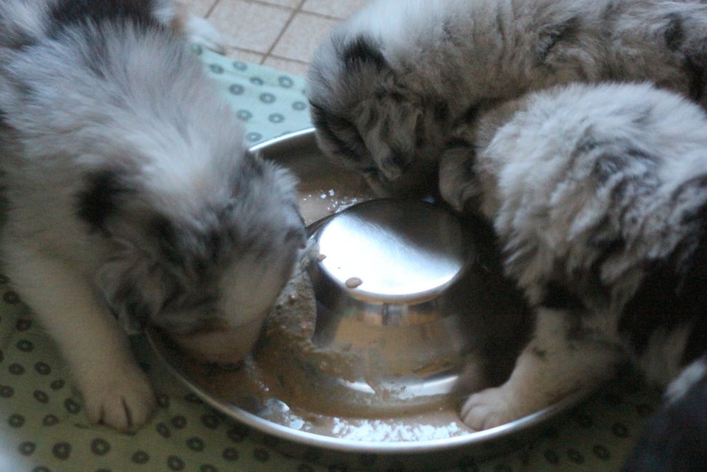 On commence à soulager maman avec un complément de lait maternisé, en même temps on s'habitue à la gamelle. Les Loulous ont vite compris...